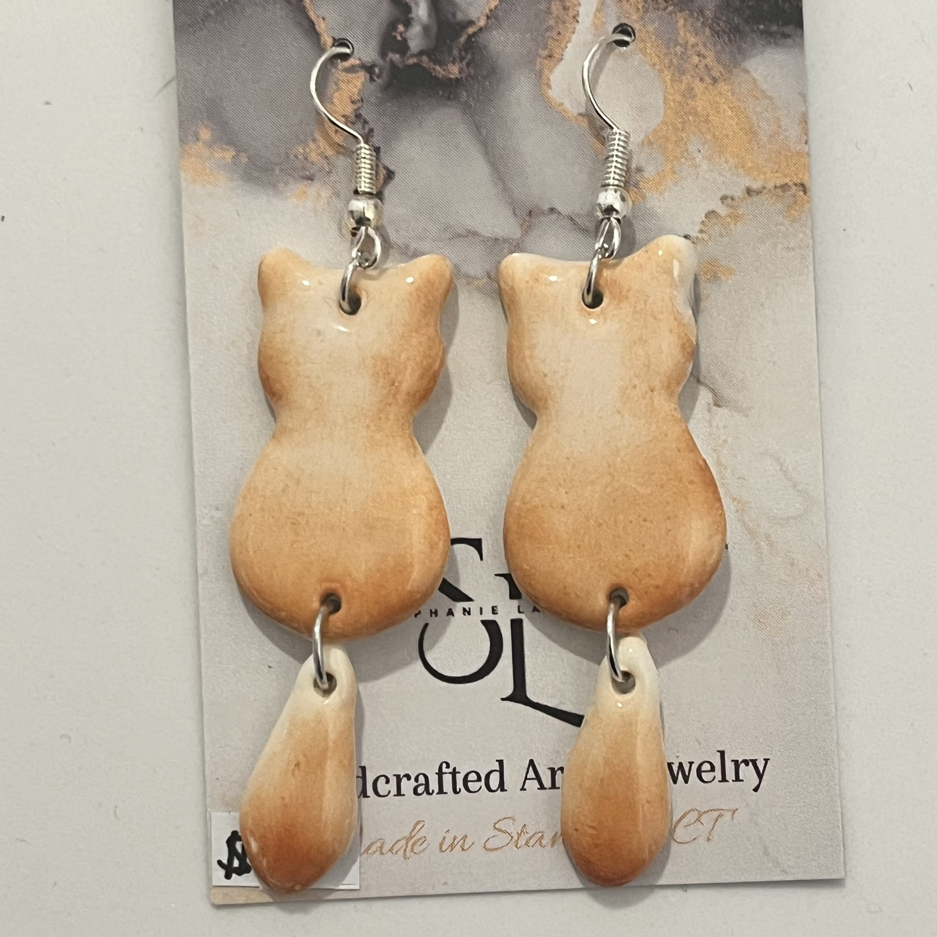 Cat dangle earrings with a wagging tail.