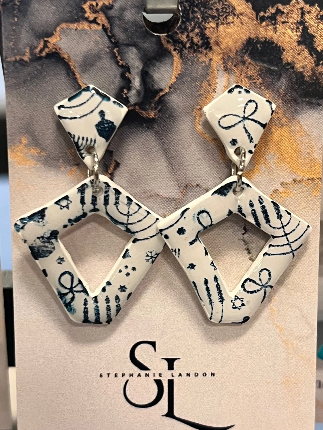 Show off your Chanukah pride with these menorah printed diamond shape earrings.