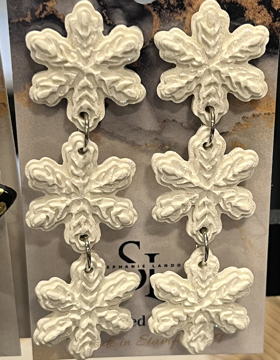 These Falling Snowflakes Trio Polymer Clay Dangle Stud Earrings are hand crafted with love.
