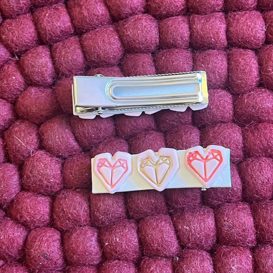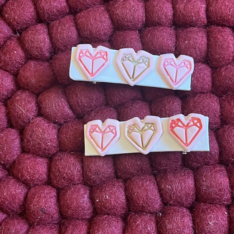 Hair clips are a great way to clip your hair back. Not only are they functional, but they are also decorative hair accessories. These hair clips come in a pack of 2 handmade clips. The geometric hearts are handmade out of polymer clay and acrylic paint and attached to silver metal alligator clips.