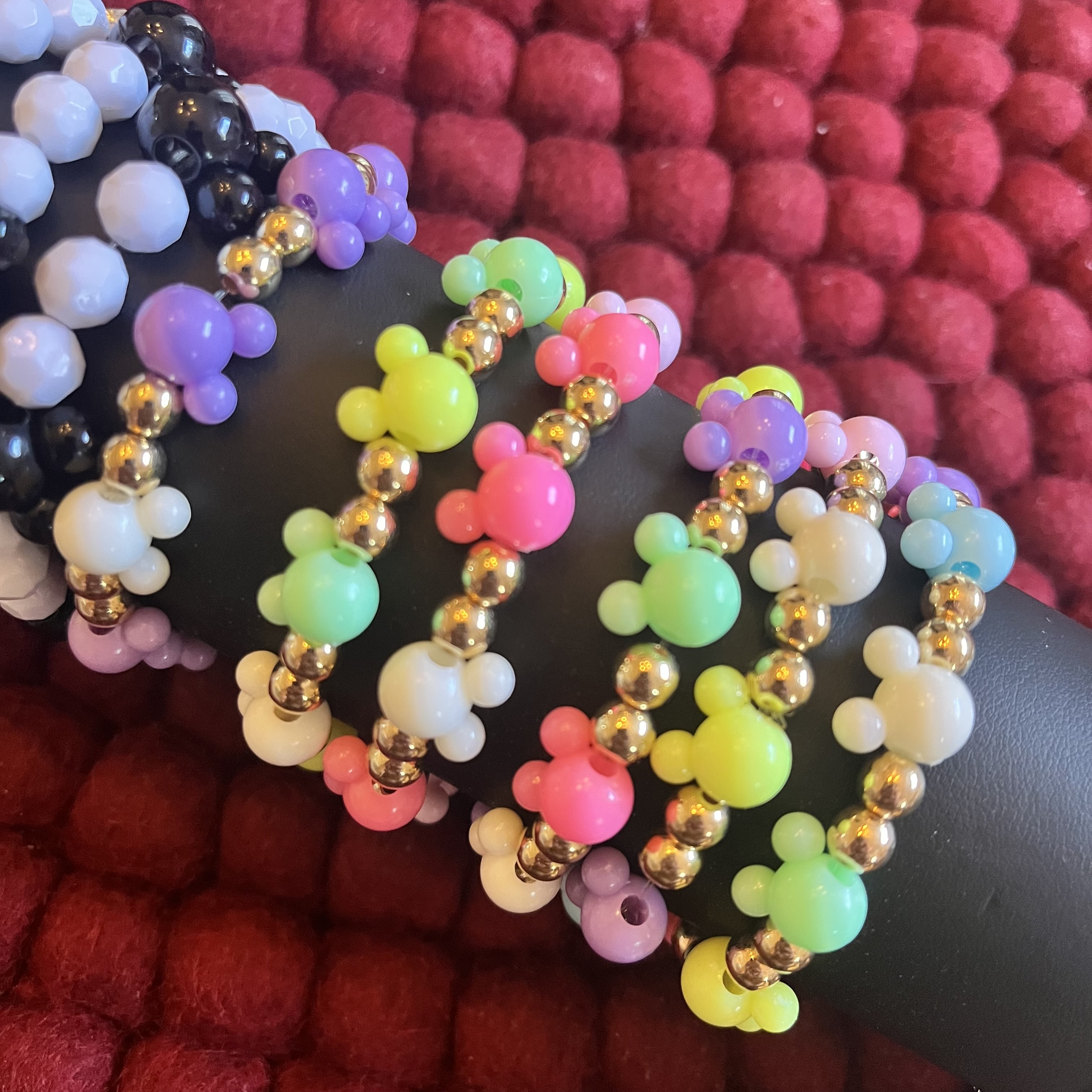 Choose from 7 pastel colorful colored, black, or white acrylic Mickey Mouse heads and 6mm gold round beads.