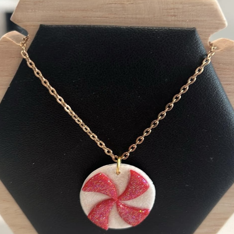 This sweet features a peppermint candy style pendant with red and white swirl/stripe pattern and a shimmery finish.