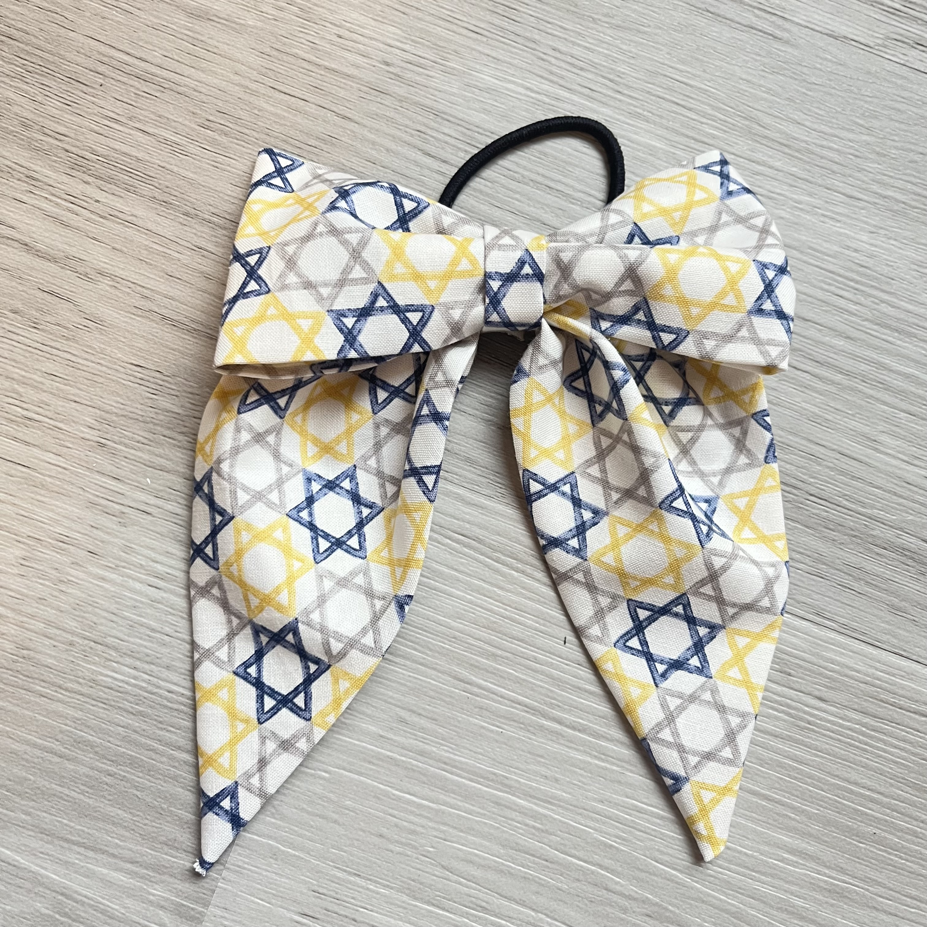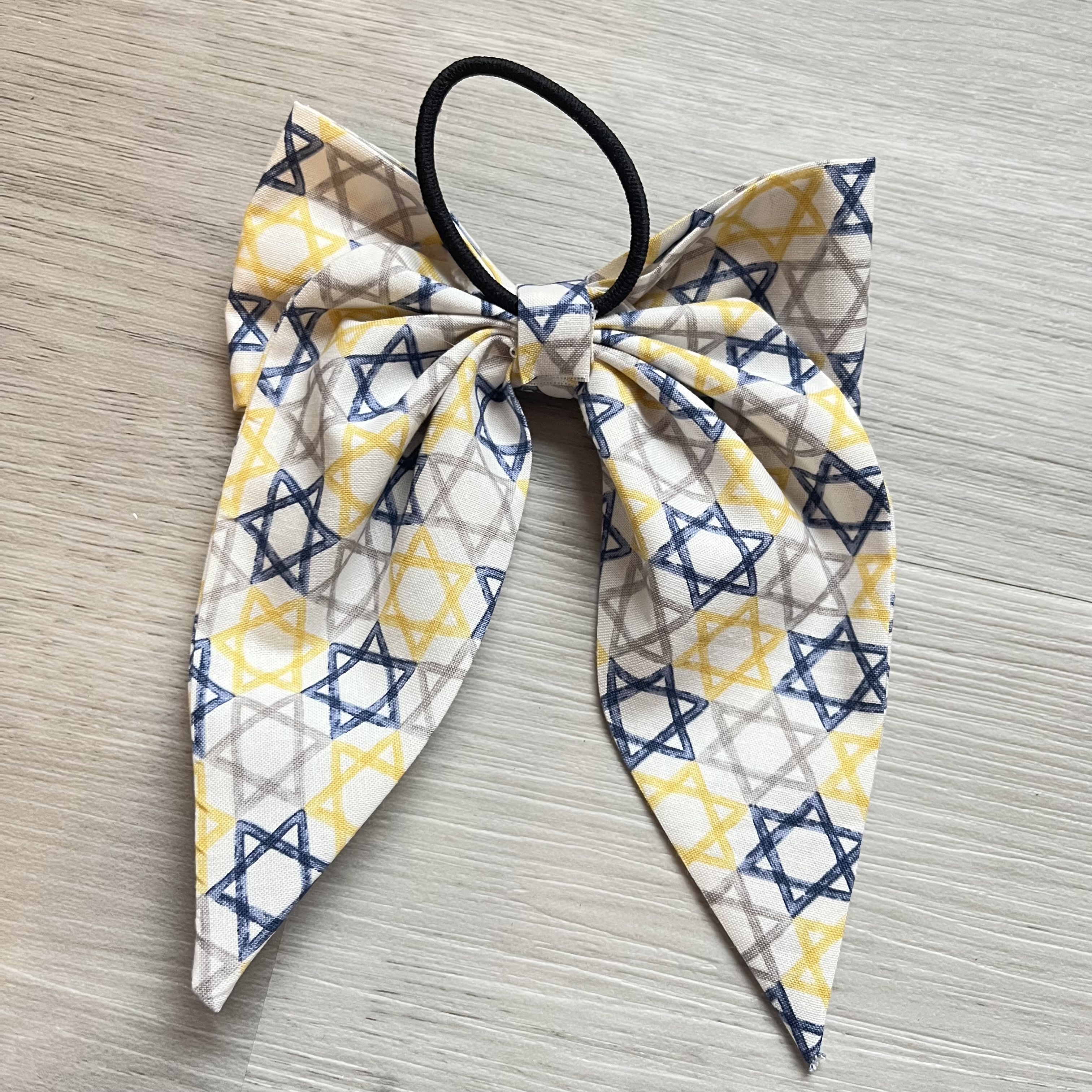 This Star of David Print Fabric Bow Ponytail is handcrafted and sewn by me.