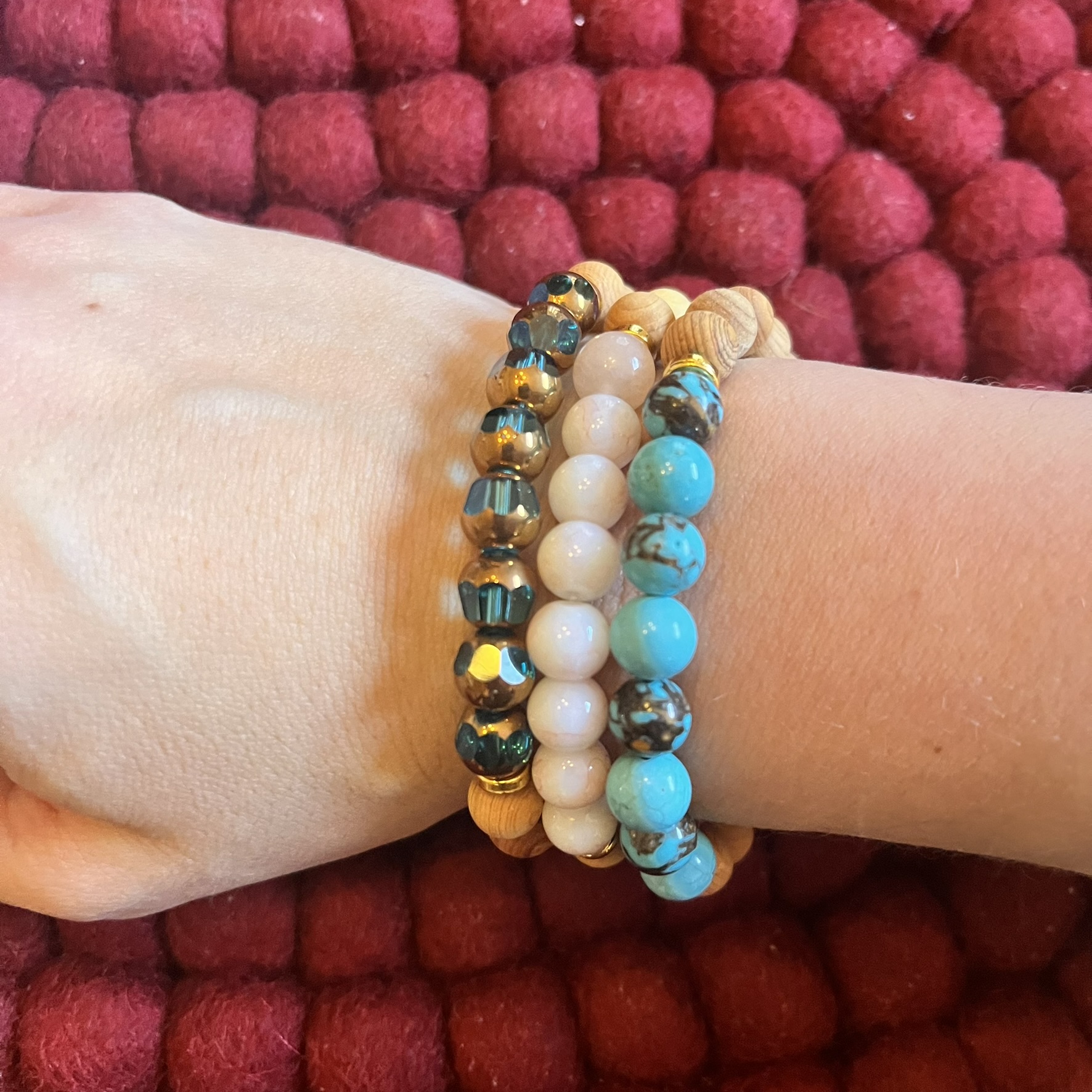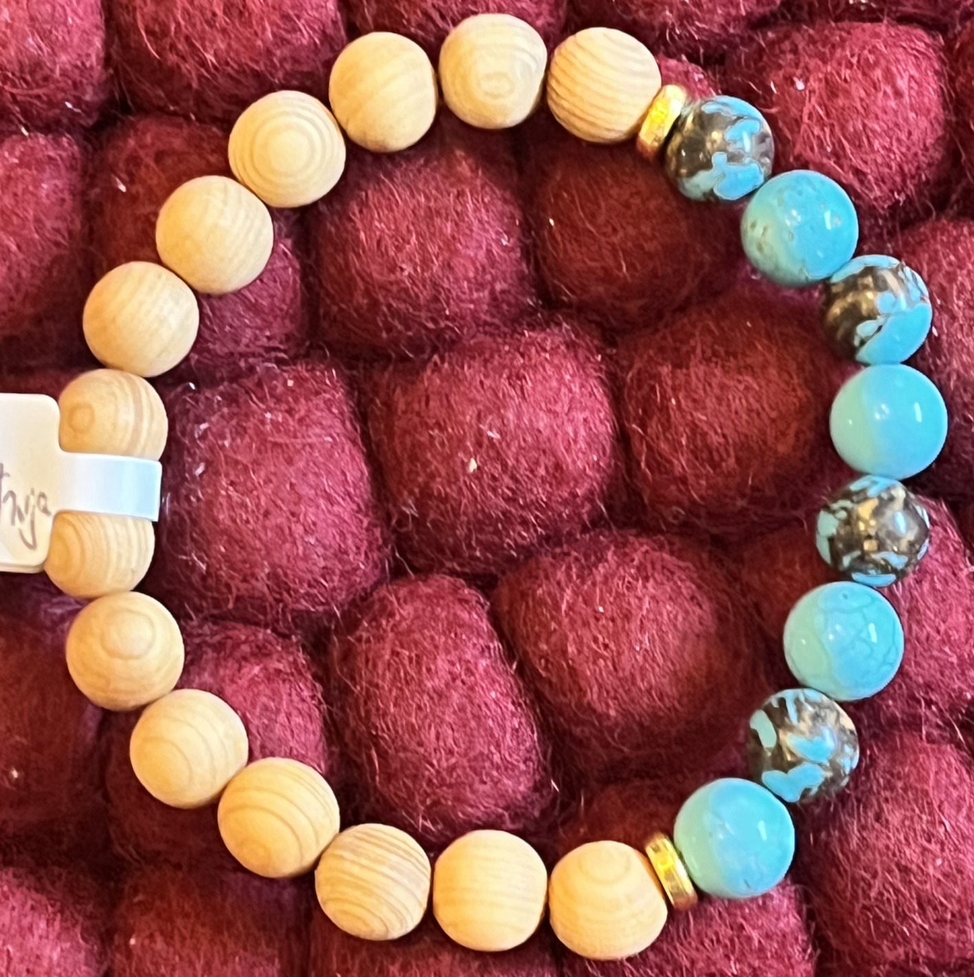 This Turquoise Siderolite + Wood Bracelet is hand crafted with love!