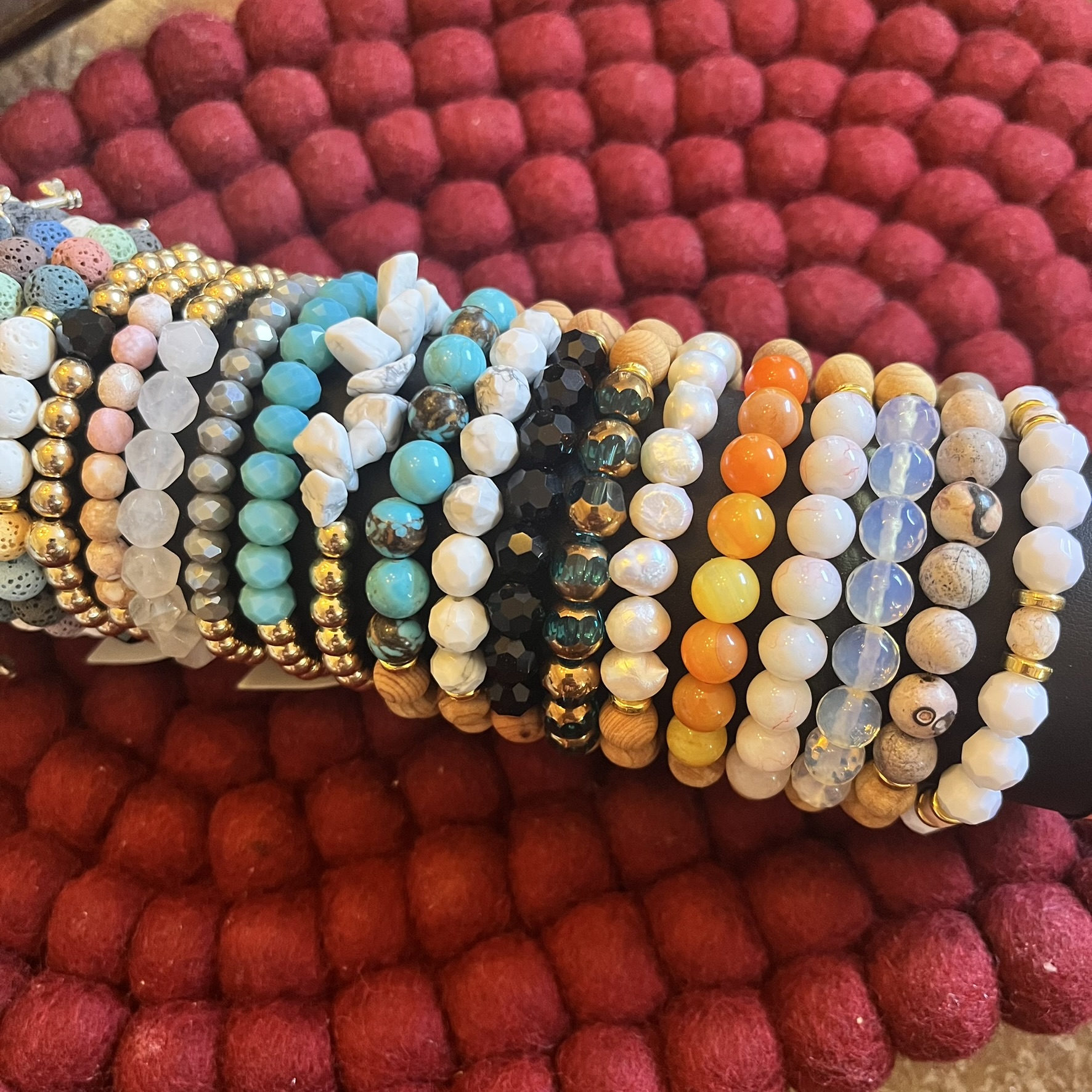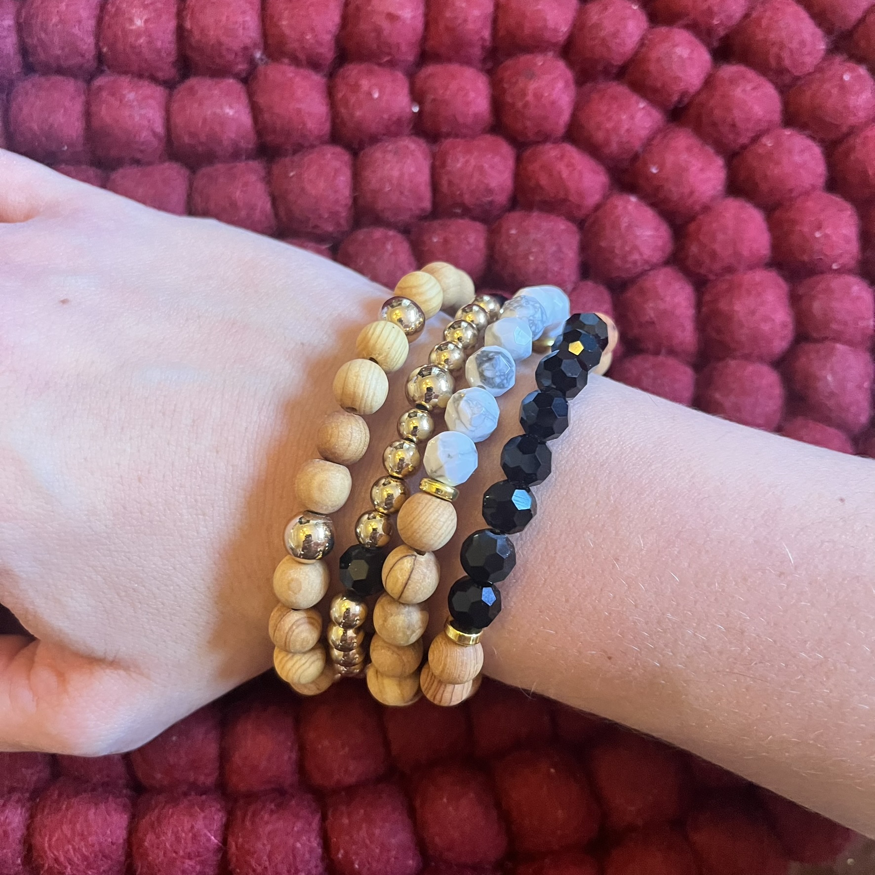Hand beaded on a high performance .8mm elastic for some stretch and to easily roll on & off your wrist.